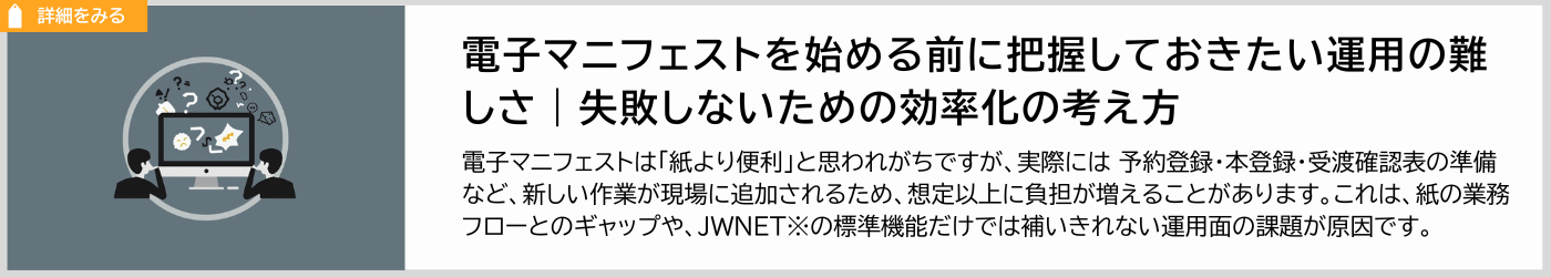 マニフェストの登録は、現場の負担が大きく、企業ごとに運用差がもっとも出やすいポイントです。