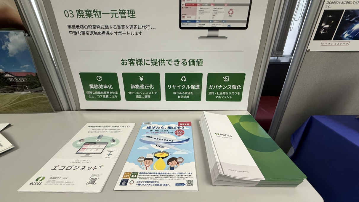 具体的には、株式会社カクヤス様と共同で取り組んでいる「廃食用油をSAF等(持続可能な航空燃料)にアップサイクルするプロジェクト」の紹介資料等を設置いたしました。限られたスペースではございましたが、ブースの前を通りかかった関係者の皆様に足を止めて資料をお手に取っていただくことで、弊社の資源循環への姿勢を広く発信する貴重な機会となりました。